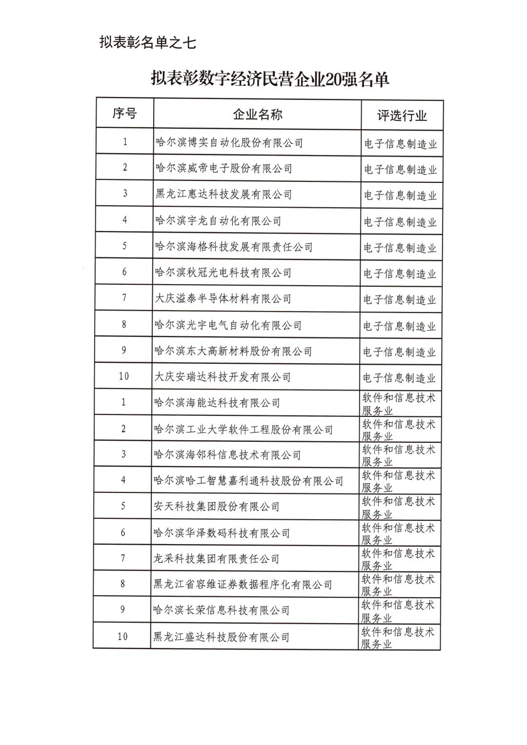 按照省委省政府關(guān)于召開全省民營經(jīng)濟(jì)大會(huì)的決策部署要求,擬對(duì)全省優(yōu)秀民營企業(yè)進(jìn)行表彰。經(jīng)企業(yè)自愿申報(bào)、市(地)把關(guān)推薦,評(píng)審小組排名,征求相關(guān)部門意見等程序,擬表彰全省累計(jì)納稅民營企業(yè)50戶、就業(yè)突出貢獻(xiàn)民營企業(yè)20戶、民營高新技術(shù)企業(yè)50戶、外向型經(jīng)濟(jì)貢獻(xiàn)民營企業(yè)30戶、龍江質(zhì)量品牌優(yōu)秀民營企業(yè)50戶、生物經(jīng)濟(jì)民營企業(yè)20戶和數(shù)字經(jīng)濟(jì)民營企業(yè)20戶?,F(xiàn)將擬表彰名單予以公示。