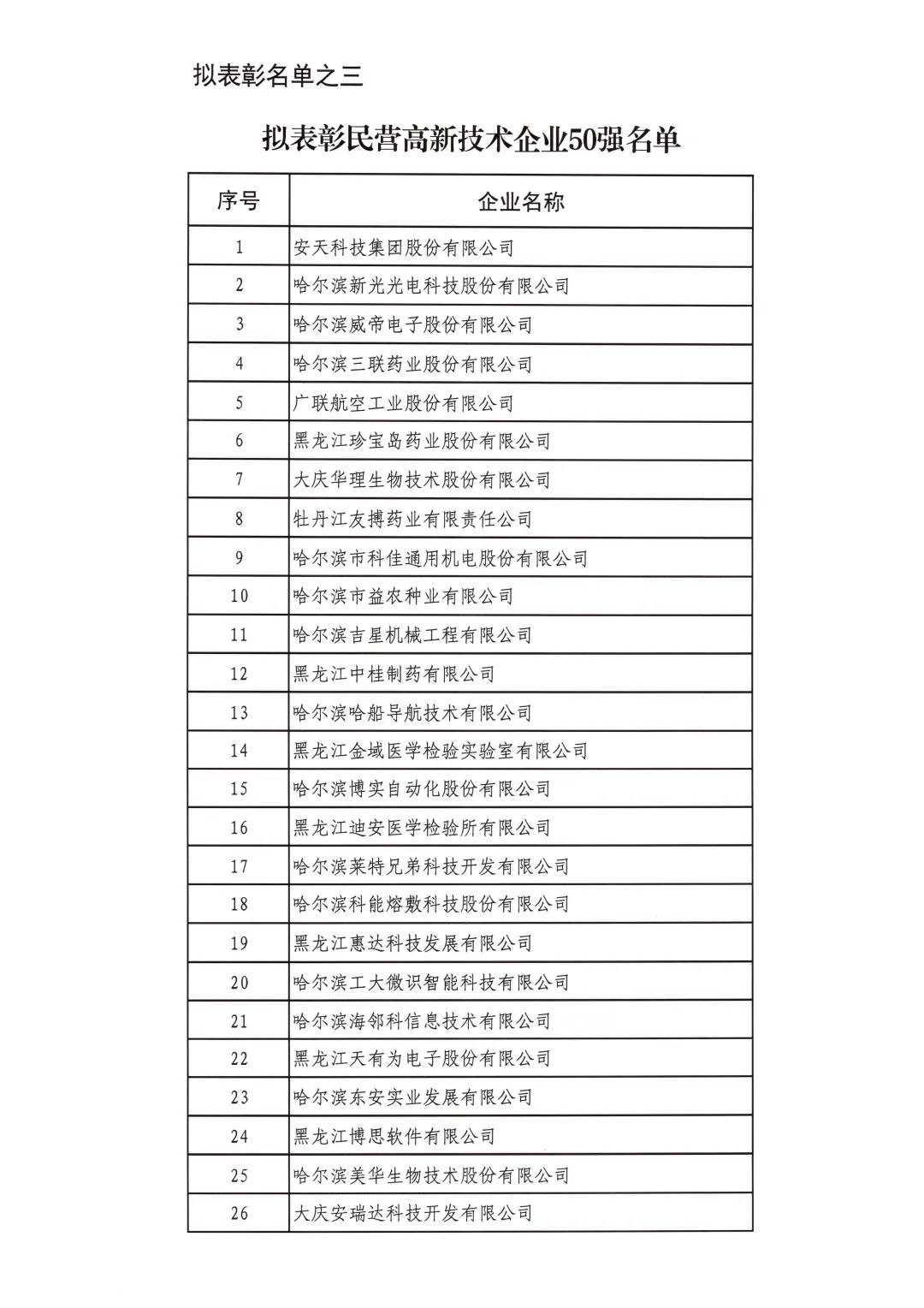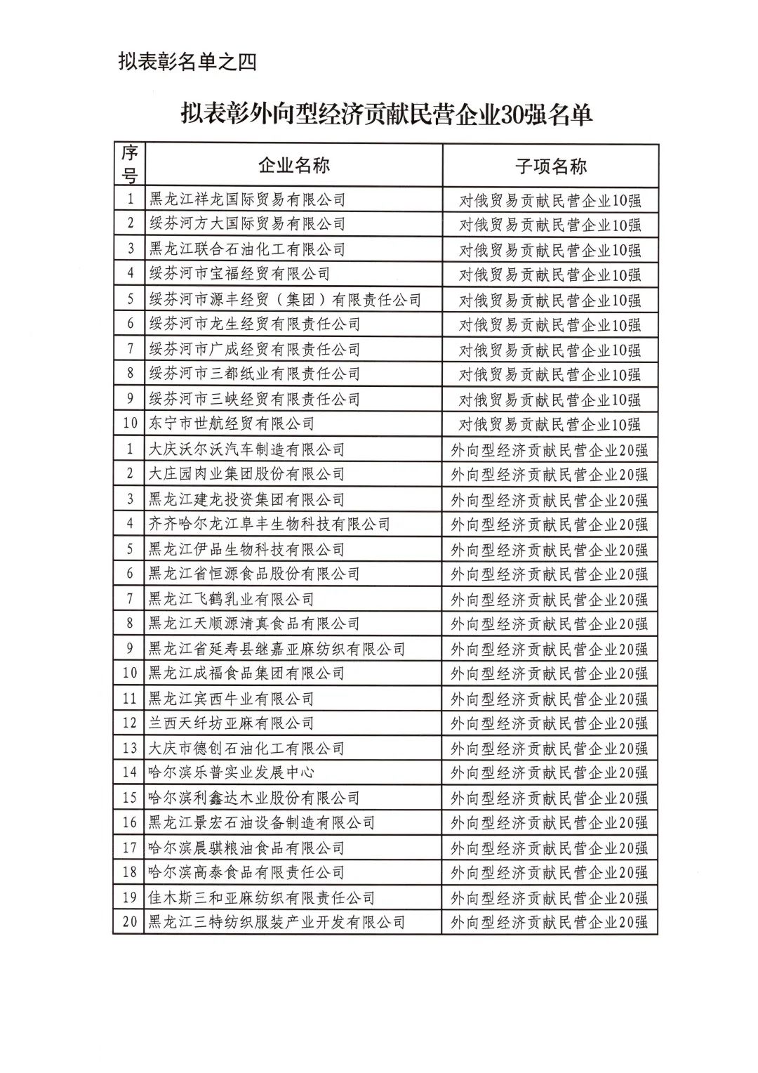 按照省委省政府關(guān)于召開全省民營經(jīng)濟(jì)大會(huì)的決策部署要求,擬對(duì)全省優(yōu)秀民營企業(yè)進(jìn)行表彰。經(jīng)企業(yè)自愿申報(bào)、市(地)把關(guān)推薦,評(píng)審小組排名,征求相關(guān)部門意見等程序,擬表彰全省累計(jì)納稅民營企業(yè)50戶、就業(yè)突出貢獻(xiàn)民營企業(yè)20戶、民營高新技術(shù)企業(yè)50戶、外向型經(jīng)濟(jì)貢獻(xiàn)民營企業(yè)30戶、龍江質(zhì)量品牌優(yōu)秀民營企業(yè)50戶、生物經(jīng)濟(jì)民營企業(yè)20戶和數(shù)字經(jīng)濟(jì)民營企業(yè)20戶?,F(xiàn)將擬表彰名單予以公示。